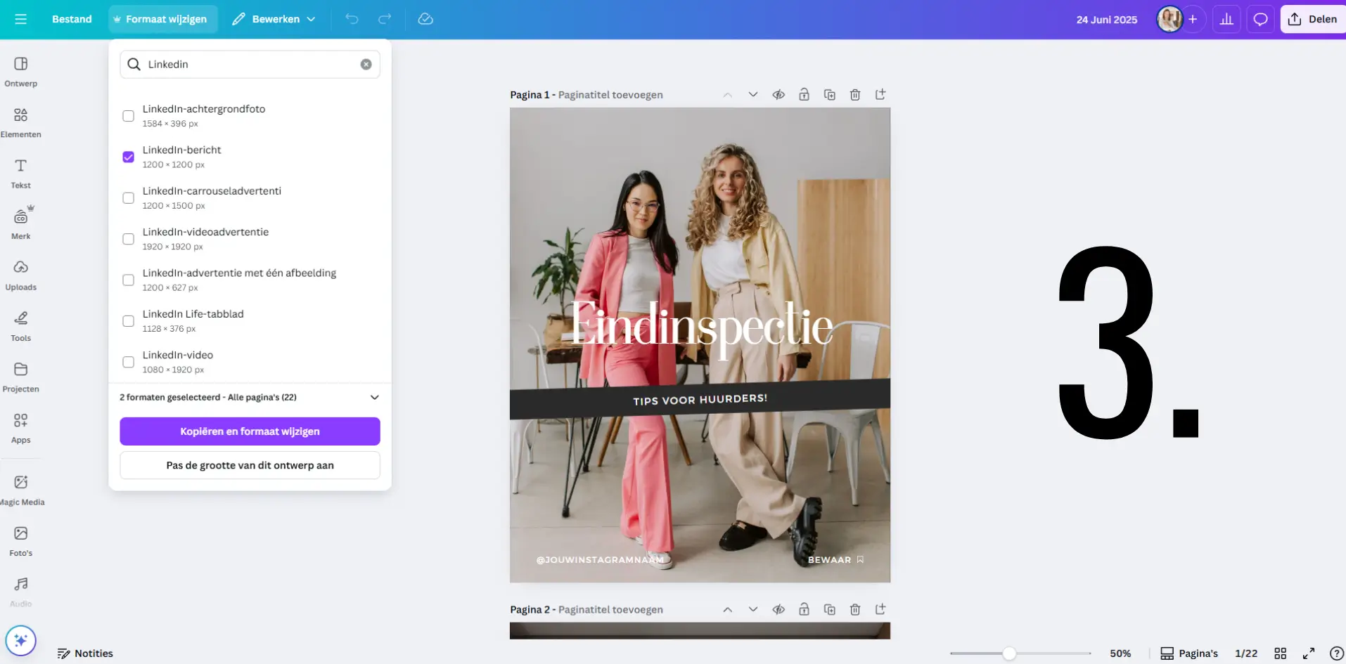 - Wanneer je in het ontwerp zit, klik je links bovenaan op “formaat wijzigen” De meeste van onze ontwerpen zijn in het portret formaat, de meest standaard gebruikte op Instagram. Is dit niet het geval dan raden we je aan om dit formaat alsnog aan te passen. In 2024 was het standaard formaat van Instagram vierkant (1080×1080)