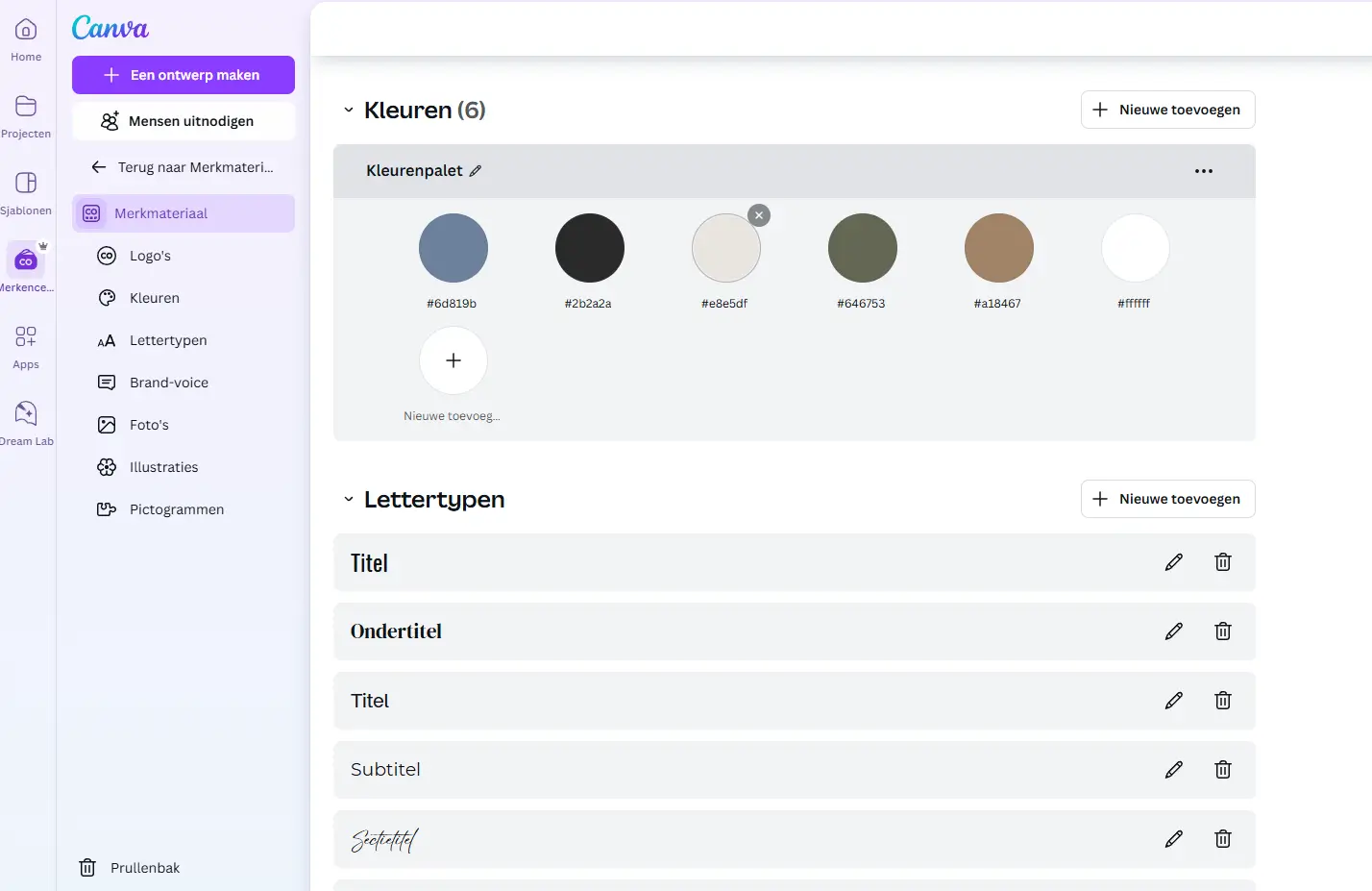 Maak merkmaterialen aan. Voeg nieuwe merkmateriaal toe en geef het een naam. Hier kan je logo’s, lettertypes, de kleuren van jouw huisstijl, foto’s van jezelf en nog veel meer toevoegen. Zie het als een brandingbook die je bewaard. Dit doe je omdat de templates dan vanuit merkmaterialen aangepast kunnen worden naar jouw lettertype en kleuren.