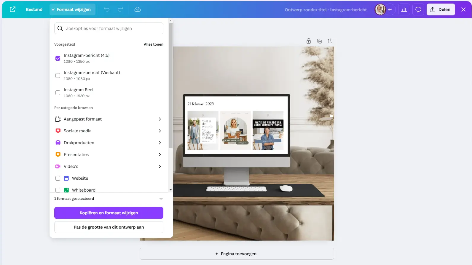 Formaat ontwerp aanpassen: Wanneer een ontwerp in vierkant formaat (1080×1080) staat, kun je eenvoudig het formaat aanpassen naar portret (1080×1350). Dit is tegenwoordig het standaard formaat van Instagram.