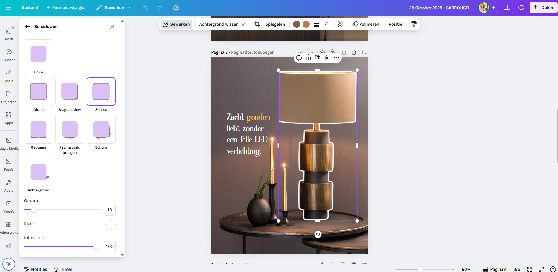 Elementen toevoegen: Als je meer tekst, afbeeldingen, vormen of andere elementen wilt toevoegen, klik dan op de opties in het linkermenu. Sleep elementen naar je sjabloon.
